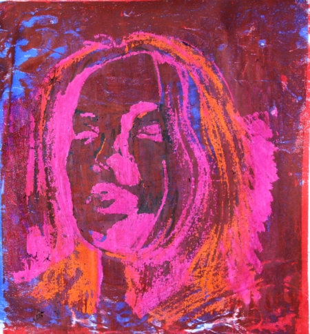 This image uses a resist technique involving oil pastel, which I apply to the print paper before introducing on to the gel plate. Because the oil pastel is oil based the paint in between the oil pastel and the gel plate resists the absorption into the paper, and remains on the plate. I then placed my large gel plate over the portrait portion of this image, and then peeled it away after a minute or so. Once the paint is dry I then scrape away the excess paint covering the oil pastel, revealing the image. The overall colour and warmth generated from that colour gives rise to the title.